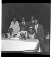 374. EAP449/2/13/374 Reference (shelfmark): EAP449/2/13/374 Title: A family photo of seven people, three women and four men around a table filled with bottles in a garden. Collection Area: Endangered Archives Programme Languages: Not applicable Date Range: 2nd half od the 20th century Extent: 1 TIFF image