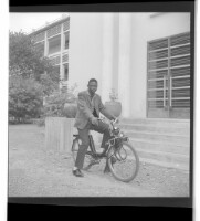 376. EAP449/2/13/376 Reference (shelfmark): EAP449/2/13/376 Title: A man wearing a jacket and pants sitting face-forward on a bicycle in front of the doorway of a house. Collection Area: Endangered Archives Programme Languages: Not applicable Date Range: 2nd half od the 20th century Extent: 1 TIFF image