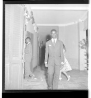 379. EAP449/2/13/379 Reference (shelfmark): EAP449/2/13/379 Title: A man wearing a suit holding the hand of a woman wearing a dress, both standing in profile in a room in front of a crowd. Collection Area: Endangered Archives Programme Languages: Not applicable Date Range: 2nd half od the 20th century Extent: 1 TIFF image