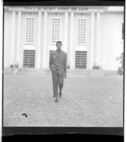 380. EAP449/2/13/380 Reference (shelfmark): EAP449/2/13/380 Title: A man wearing a suit walking face-forward in front of a large house. Collection Area: Endangered Archives Programme Languages: Not applicable Date Range: 2nd half od the 20th century Extent: 1 TIFF image