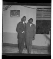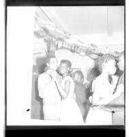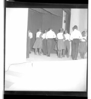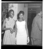 Two women, one wearing a dress and hat and the other wearing a dress, holding each other's hands and standing in profile in a room in front of a window.