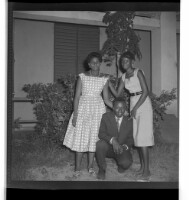 A man wearing a suit crouching face-forward in between two girls wearing dresses and necklaces, one standing face-forward and the other standing in profile, in front of a window of a house.