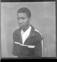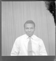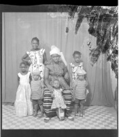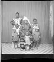 A photo of a family: eight people, two women standing, an old man wearing a white boubou and a black fez sitting in between with a baby, two boys, and one little girl standing, all face-forward in the studio.