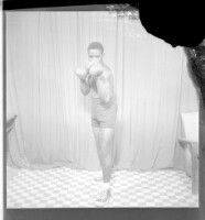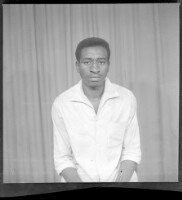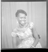 A woman wearing a dress, a white head-wrap, and a black necklace sitting with a baby wearing a black t-shirt and white shorts, both face-forward in the studio.