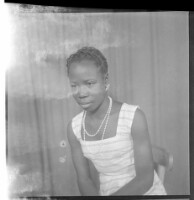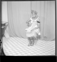 74. EAP449/2/13/74 Reference (shelfmark): EAP449/2/13/74 Title: A woman wearing a camisole, pagne, and earrings sitting face-forward on a chair in the studio. Collection Area: Endangered Archives Programme Languages: Not applicable Date Range: 2nd half od the 20th century Extent: 1 TIFF image