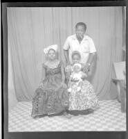 77. EAP449/2/13/77 Reference (shelfmark): EAP449/2/13/77 Title: Four people, two women wearing dresses, head-wraps, and earrings sitting, one with a baby in a white outfit, and a man wearing a white shirt and a wrist watch with a cigarette in his mouth standing face-forward in the studio. Collection Area: Endangered Archives Programme Languages: Not applicable Date Range: 2nd half od the 20th century Extent: 1 TIFF image