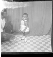 80. EAP449/2/13/80 Reference (shelfmark): EAP449/2/13/80 Title: A baby wearing a white outfit standing next to a young man on his knees in profile in the studio. Collection Area: Endangered Archives Programme Languages: Not applicable Date Range: 2nd half od the 20th century Extent: 1 TIFF image