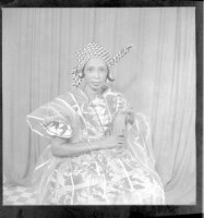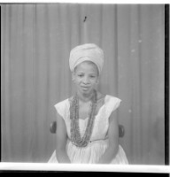539. EAP449/2/14/539 Reference (shelfmark): EAP449/2/14/539 Title: A woman wearing a dress, a head wrap, necklaces, and earrings sitting face-forward in a chair in the studio. Collection Area: Endangered Archives Programme Languages: Not applicable Date Range: 2nd half od the 20th century Extent: 1 TIFF image