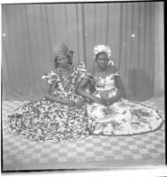536. EAP449/2/14/536 Reference (shelfmark): EAP449/2/14/536 Title: Two women wearing dresses, head wraps, and necklaces sitting face-forward on the ground with their arms crossed in the studio. Collection Area: Endangered Archives Programme Languages: Not applicable Date Range: 2nd half od the 20th century Extent: 1 TIFF image