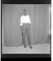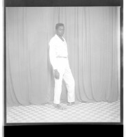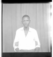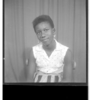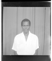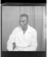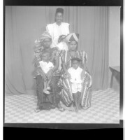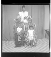 Two women wearing dresses, pagnes, head wraps, and necklaces sitting face-forward, each holding a child on their laps and a man wearing a boubou and hat standing face-forward behind in the studio.