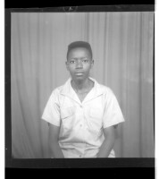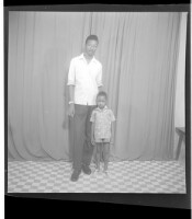 150. EAP449/2/15/150 Reference (shelfmark): EAP449/2/15/150 Title: A man wearing a shirt and pants standing in profile and a boy wearing a shirt and shorts standing face-forward next to him in the studio. Collection Area: Endangered Archives Programme Languages: Not applicable Date Range: 2nd half od the 20th century Extent: 1 TIFF image