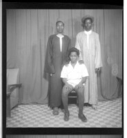 144. EAP449/2/15/144 Reference (shelfmark): EAP449/2/15/144 Title: A man wearing a shirt, shorts, and a hat sitting face-forward in front of two men wearing boubous and hats standing face-forward in the studio. Collection Area: Endangered Archives Programme Languages: Not applicable Date Range: 2nd half od the 20th century Extent: 1 TIFF image