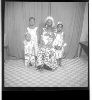 215. EAP449/2/15/215 Reference (shelfmark): EAP449/2/15/215 Title: A woman wearing a dress, pagne, head wrap, and necklace sitting face-forward holding a baby on her lap; a girl and a boy standing to her right and a girl standing to her left in the studio. Collection Area: Endangered Archives Programme Languages: Not applicable Date Range: 2nd half od the 20th century Extent: 1 TIFF image