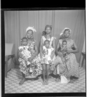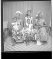 218. EAP449/2/15/218 Reference (shelfmark): EAP449/2/15/218 Title: Three women wearing dresses, pagnes, and head wraps sitting face-forward each holding a child on their laps in the studio. Collection Area: Endangered Archives Programme Languages: Not applicable Date Range: 2nd half od the 20th century Extent: 1 TIFF image