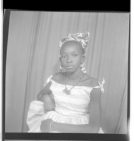 236. EAP449/2/15/236 Reference (shelfmark): EAP449/2/15/236 Title: A woman wearing a dress, pagne, head wrap, and necklace sitting face-forward in the studio. Collection Area: Endangered Archives Programme Languages: Not applicable Date Range: 2nd half od the 20th century Extent: 1 TIFF image
