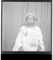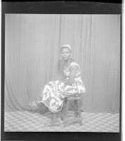 235. EAP449/2/15/235 Reference (shelfmark): EAP449/2/15/235 Title: A woman wearing a large dress and head wrap sitting face-forward in the studio. Collection Area: Endangered Archives Programme Languages: Not applicable Date Range: 2nd half od the 20th century Extent: 1 TIFF image