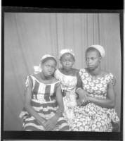 237. EAP449/2/15/237 Reference (shelfmark): EAP449/2/15/237 Title: Three women wearing dresses, pagnes, and head wraps, the one in the middle sitting face-forward and the others sitting in profile in the studio. Collection Area: Endangered Archives Programme Languages: Not applicable Date Range: 2nd half od the 20th century Extent: 1 TIFF image
