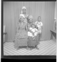 239. EAP449/2/15/239 Reference (shelfmark): EAP449/2/15/239 Title: Three women wearing dresses, pagnes, head wraps, and necklaces, two sitting face-forward, one holding a little girl on her lap, and the other standing face-forward, and a man standing behind in the studio. Collection Area: Endangered Archives Programme Languages: Not applicable Date Range: 2nd half od the 20th century Extent: 1 TIFF image