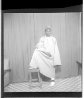 240. EAP449/2/15/240 Reference (shelfmark): EAP449/2/15/240 Title: A man wearing a boubou and hat standing face-forward posing with his foot on a stool in the studio. Collection Area: Endangered Archives Programme Languages: Not applicable Date Range: 2nd half od the 20th century Extent: 1 TIFF image