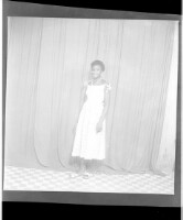 251. EAP449/2/15/251 Reference (shelfmark): EAP449/2/15/251 Title: A woman wearing a dress and necklace standing in profile in the studio. Collection Area: Endangered Archives Programme Languages: Not applicable Date Range: 2nd half od the 20th century Extent: 1 TIFF image