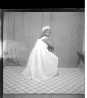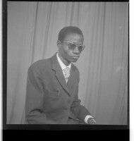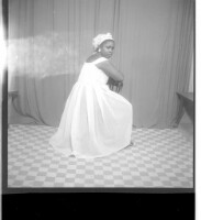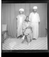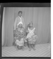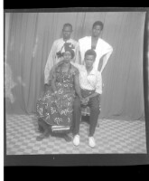 A man wearing a shirt and pants sitting face-forward next to a woman wearing a dress, head wrap, and necklace sitting face-forward, and two men standing face-forward behind in the studio.