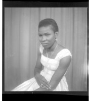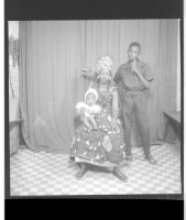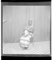A boy wearing a shirt and pants standing face-forward next to a woman wearing a dress, pagne, head wrap, and necklace sitting face-forward holding a baby on her lap in the studio.