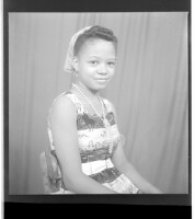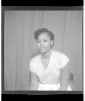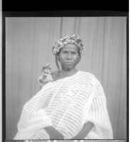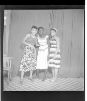 Three women: two wearing dresses and necklaces, one wearing a head wrap, and the other wearing a shirt and skirt, all standing, one in profile and the other two face-forward in the studio.