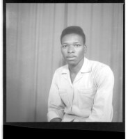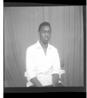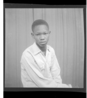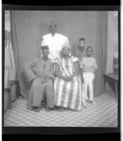 A man wearing a boubou and hat sitting face-forward next to a woman wearing a dress, head wrap, and necklace sitting face-forward in front of a man wearing a boubou and hat standing face-forward and next to two boys standing face-forward in the studio.