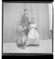 324. EAP449/2/15/324 Reference (shelfmark): EAP449/2/15/324 Title: A man wearing a suit standing in profile in between two women wearing dresses and head wraps sitting face-forward in the studio. Collection Area: Endangered Archives Programme Languages: Not applicable Date Range: 2nd half od the 20th century Extent: 1 TIFF image