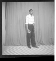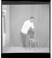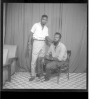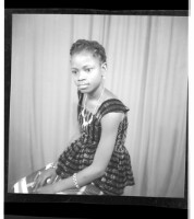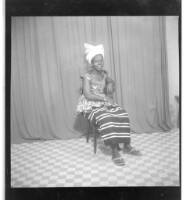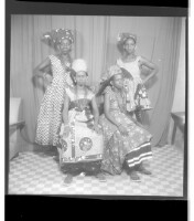 Four women wearing dresses, pagnes, head wraps, and a couple in necklaces: two sitting in front, one face-forward and the other in profile, and the other two standing face-forward behind in the studio.