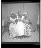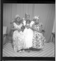 Three women wearing dresses and head wraps, two also wearing necklaces: one is sitting in profile and the other two are sitting face-forward in the studio.