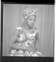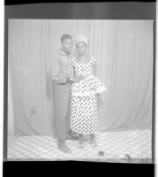 371. EAP449/2/15/371 Reference (shelfmark): EAP449/2/15/371 Title: A man wearing a shirt and pants standing in profile next to a woman wearing a dress, pagne, head wrap, and necklace standing face-forward in the studio. Collection Area: Endangered Archives Programme Languages: Not applicable Date Range: 2nd half od the 20th century Extent: 1 TIFF image
