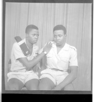 378. EAP449/2/15/378 Reference (shelfmark): EAP449/2/15/378 Title: Two men wearing shirts and shorts both sitting in profile in the studio. Collection Area: Endangered Archives Programme Languages: Not applicable Date Range: 2nd half od the 20th century Extent: 1 TIFF image