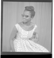 379. EAP449/2/15/379 Reference (shelfmark): EAP449/2/15/379 Title: A woman wearing a dress and glasses sitting in profile in the studio. Collection Area: Endangered Archives Programme Languages: Not applicable Date Range: 2nd half od the 20th century Extent: 1 TIFF image
