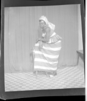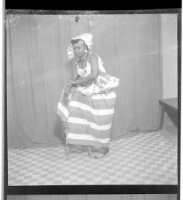 414. EAP449/2/15/414 Reference (shelfmark): EAP449/2/15/414 Title: A woman wearing a dress, pagne, head wrap, and necklace standing in profile posing with her foot on a chair in the studio. Collection Area: Endangered Archives Programme Languages: Not applicable Date Range: 2nd half od the 20th century Extent: 1 TIFF image