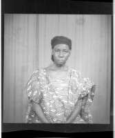 421. EAP449/2/15/421 Reference (shelfmark): EAP449/2/15/421 Title: A woman wearing a large dress and head wrap sitting face-forward in the studio. Collection Area: Endangered Archives Programme Languages: Not applicable Date Range: 2nd half od the 20th century Extent: 1 TIFF image