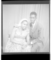 429. EAP449/2/15/429 Reference (shelfmark): EAP449/2/15/429 Title: A man wearing a jacket and tie sitting face-forward next to a woman wearing a dress, head wrap, and necklace sitting in profile in the studio. Collection Area: Endangered Archives Programme Languages: Not applicable Date Range: 2nd half od the 20th century Extent: 1 TIFF image