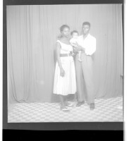 430. EAP449/2/15/430 Reference (shelfmark): EAP449/2/15/430 Title: A man wearing a shirt and pants standing face-forward holding a baby in his arms next to a woman wearing a dress standing in profile in the studio. Collection Area: Endangered Archives Programme Languages: Not applicable Date Range: 2nd half od the 20th century Extent: 1 TIFF image