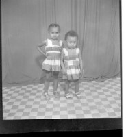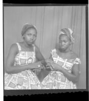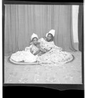 Two women laying in the studio wearing dresses and head scarves, leaning against each other. One taken from profile view and the other from full frontal view.