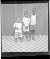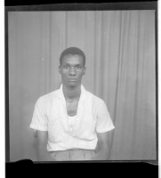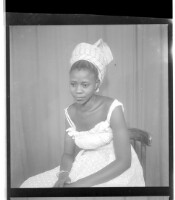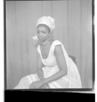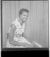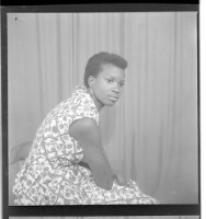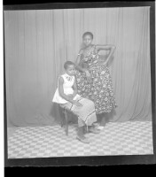 Profile view of two women in the studio. One wearing a dress, standing with her foot placed on a chair. The other sitting in the chair wearing a wrapper dress.