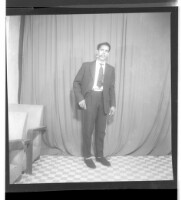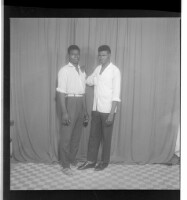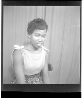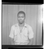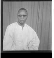 A family of ten people: an older man in a boubou and hat in-between two women wearing dresses and necklaces. The woman on the right has a baby in her arms. In front of them are three children. Behind them are two people: a man wearing a boubou and a hat b