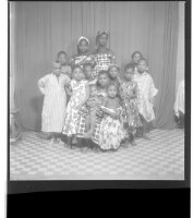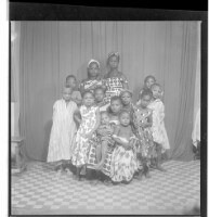 584. EAP449/2/15/584 Reference (shelfmark): EAP449/2/15/584 Title: Group photo of thirteen people in which there are three boys standing and ten girls, some of whom are standing and some sitting. Collection Area: Endangered Archives Programme Languages: Not applicable Date Range: 2nd half od the 20th century Extent: 1 TIFF image