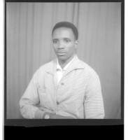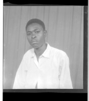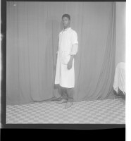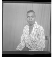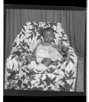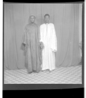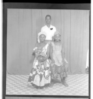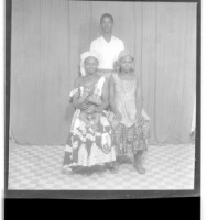 Full frontal view of four people in the studio, two of whom are women sitting down and wearing robes pagne (wrapper dresses), head scarfs, and chain necklaces. One woman is holding a baby in her lap. Behind them stands a man wearing a shirt.