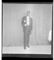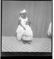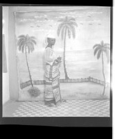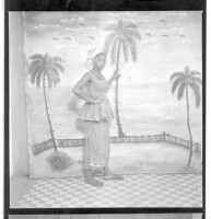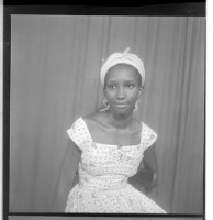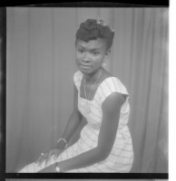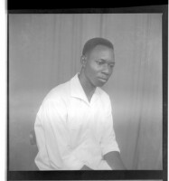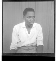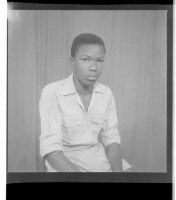 Full frontal view of five people in the studio. A man sitting down and wearing a shirt and pants, holding a little boy on his lap. A woman sitting down next to him and wearing a robe pagne (wrapper dress), head scarf, and chain necklace. She has a baby in