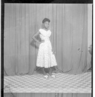 669. EAP449/2/15/669 Reference (shelfmark): EAP449/2/15/669 Title: Profile view of a woman standing in the studio wearing a dress and a chain necklace. Collection Area: Endangered Archives Programme Languages: Not applicable Date Range: 2nd half od the 20th century Extent: 1 TIFF image