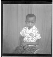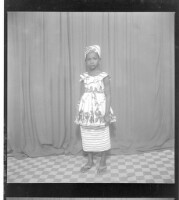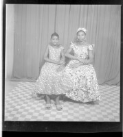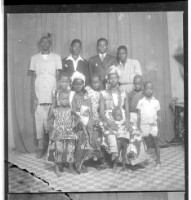 Full frontal family photo of thirteen people in the studio: a little girl wearing a dress standing between two women sitting in dresses, head scarves, and necklaces. The women each have a baby in their lap. Two boys stand to their left and two little girl