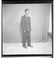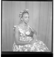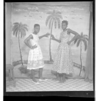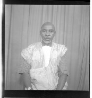 Full frontal view of three people in the studio: a man wearing a shirt and pants sitting next to a woman wearing a robe pagne (wrapper dress) and necklace. Behind them stands a man wearing a shirt, pants, and a brimmed hat.