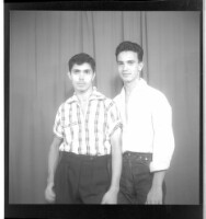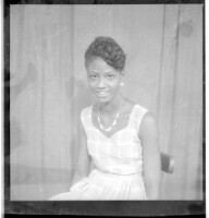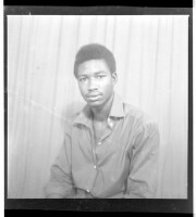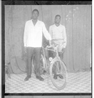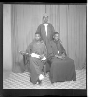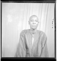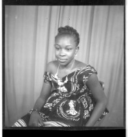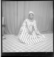 Full frontal view of a man standing in the studio wearing a shirt and shorts next to a woman sitting down and wearing a robe pagne (wrapper dress) and a head scarf.