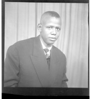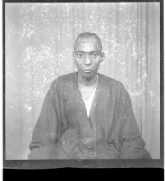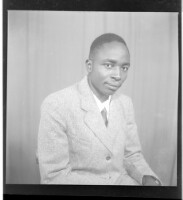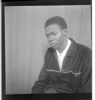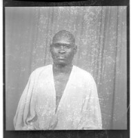Photo of five men. Two are sitting down wearing shirts: one in shorts and the other in pants and a hat. Behind them stand three men profile view: two in shirts, one wearing pants and the holding a guitar, the other wearing shorts. The third is wearing pan