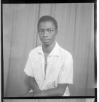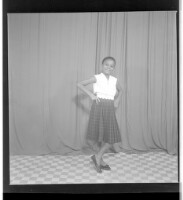 Full frontal view of a man standing in the studio wearing a shirt, pants, and sunglasses in between two girls wearing dresses. One of the girls is wearing a head scarf.
